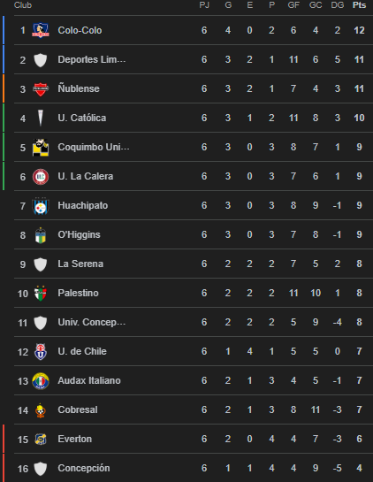 La sexta jornada del Torneo Nacional terminó con varias sorpresas en la tabla. Una de ellas es el nuevo líder Colo Colo, que tras vencer a Audax Italiano terminó en la cima con doce puntos. A su vez, el cierre de la jornada se dio con el empate entre Universidad de Chile y Universidad de Concepción, resultado que dejó la parte alta muy apretada en el inicio del torneo.
